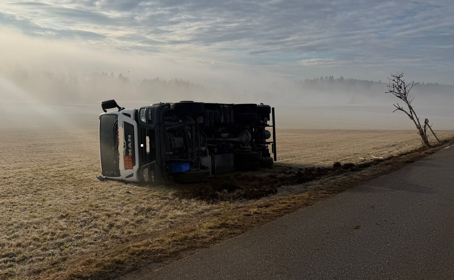 Zum zweiten Mal innerhalb weniger Wochen wurden wir zu einem verunfallten Lkw gerufen. Dieser kam im Ortsteil Dorfen neben der Straße seitlich zum Liegen. Der Fahrer konnte das Unfallfahrzeug augenscheinlich unverletzt verlassen. Wir unterstützten die örtlich zuständige Feuerwehr Dorfen und übernahmen die Verkehrsabsperrung.